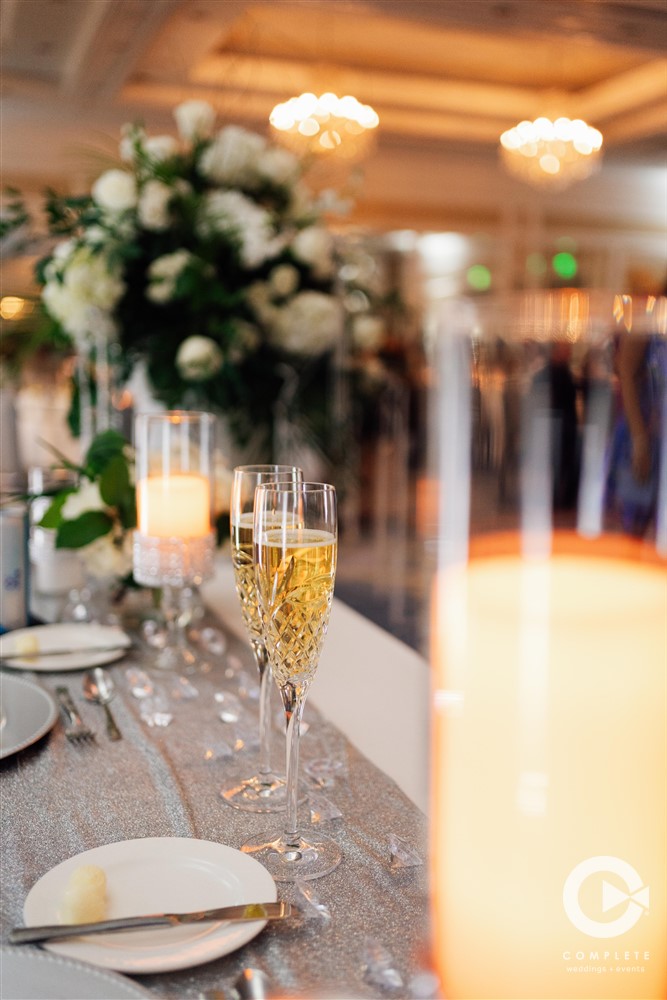 The silver soiree continued for their bling-worthy Hilton Marco Island wedding reception, in one of the resorts’ ballrooms. Astoundingly, all the wedding decor was created by Tess! The newlyweds sweetheart table even spelled out the word “love” in shiny gemstones! Complete Weddings + Events Fort Myers provided wedding coordination, photography, videography, entertainment, and special effects.